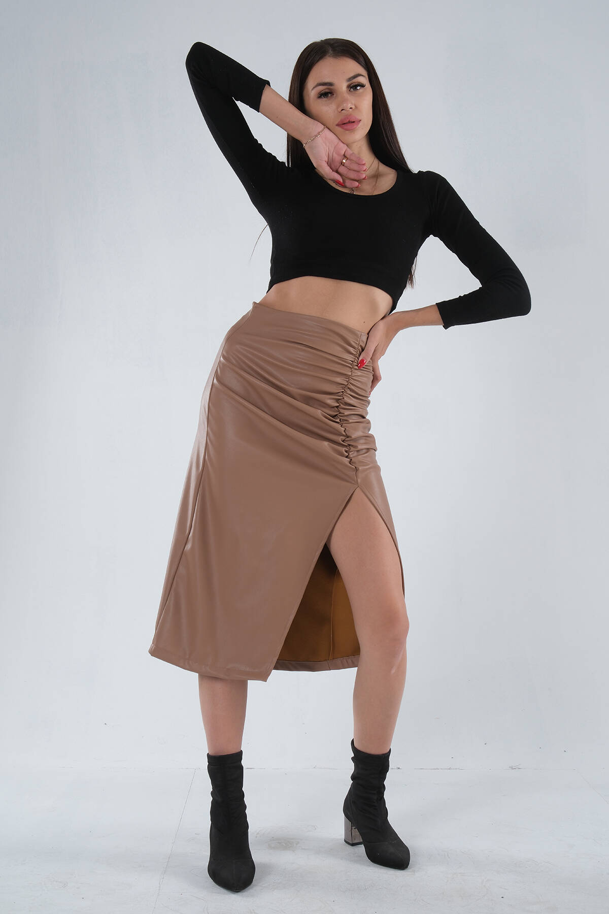 Sütlü Kahve Büzgülü Deri Etek 0101064.374
