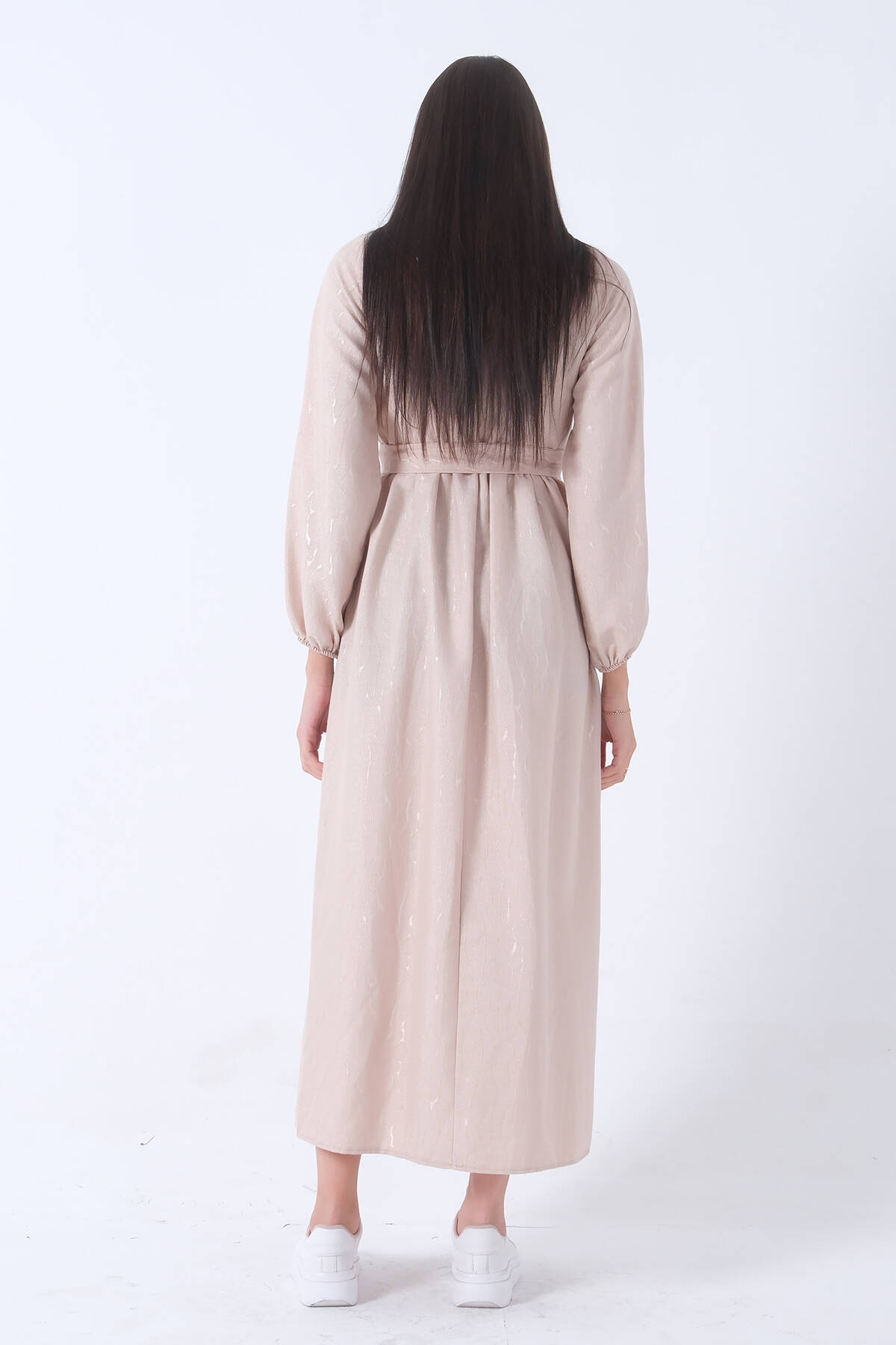 Bej Belden Bağlamalı Yaka Fırfır Detaylı Düğme Kapamalı Elbise 4571574.55