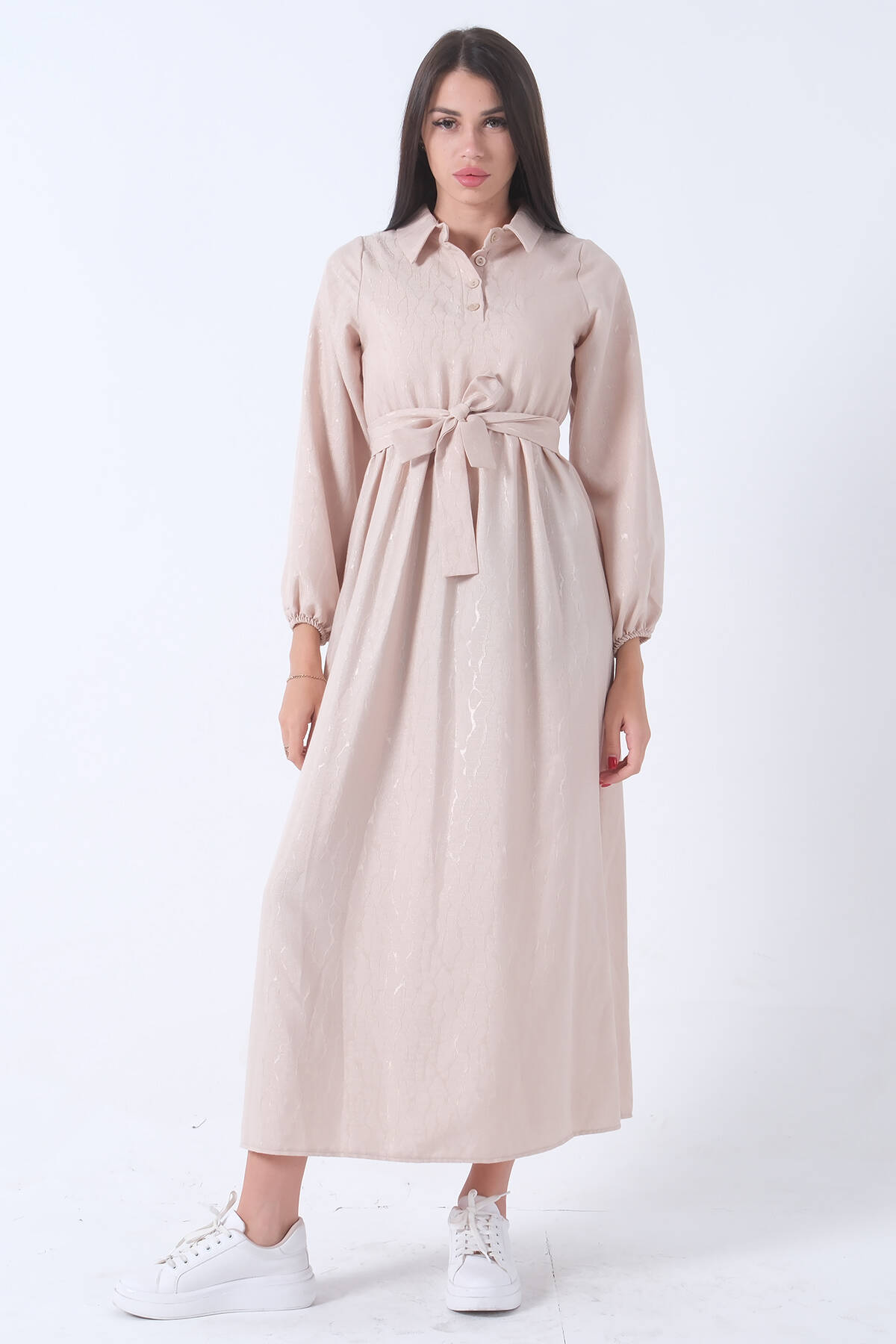 Taş Beli Lastikli Gömlek Yaka Kuşaklı Tesettür Elbise 4593296.50