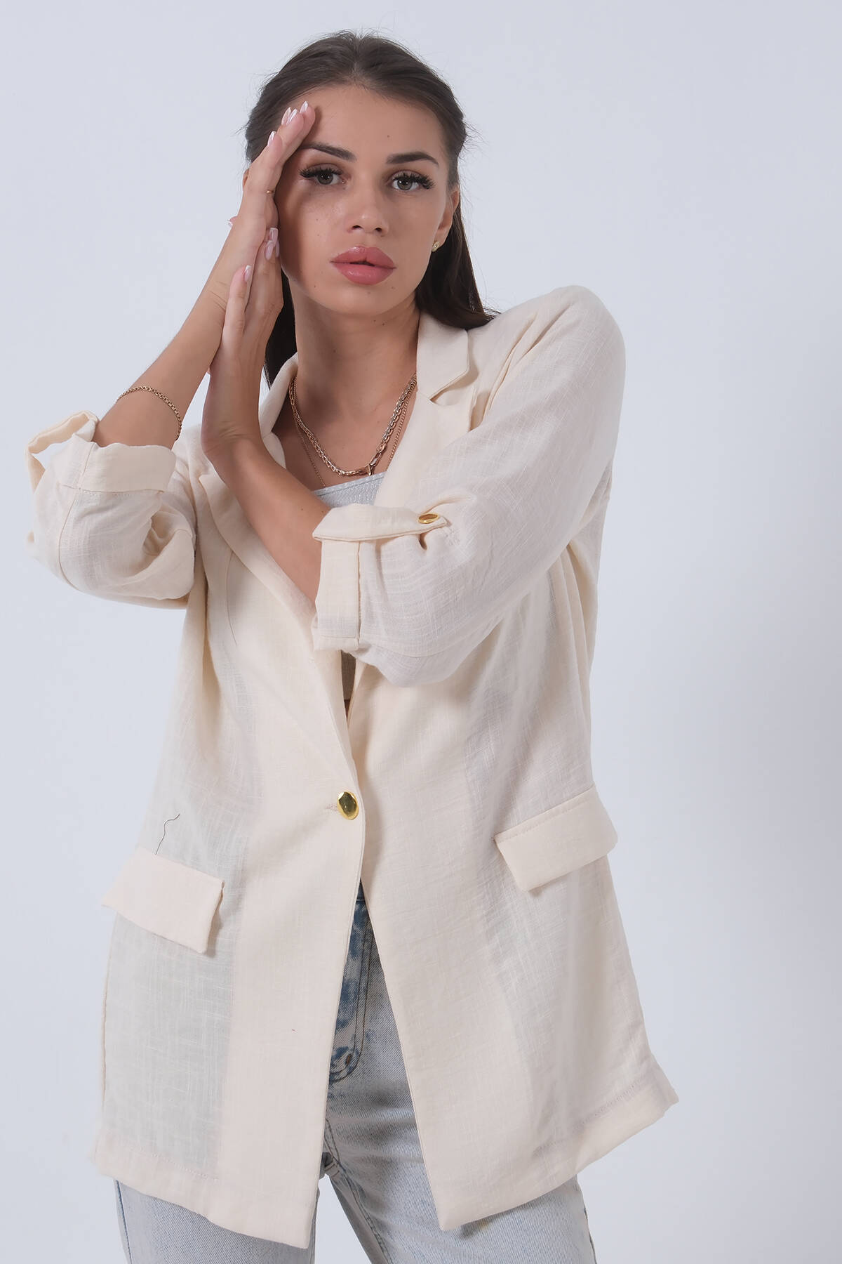 Taş Kolları Düğme Toparlamalı Keten Ceket 01051361.50