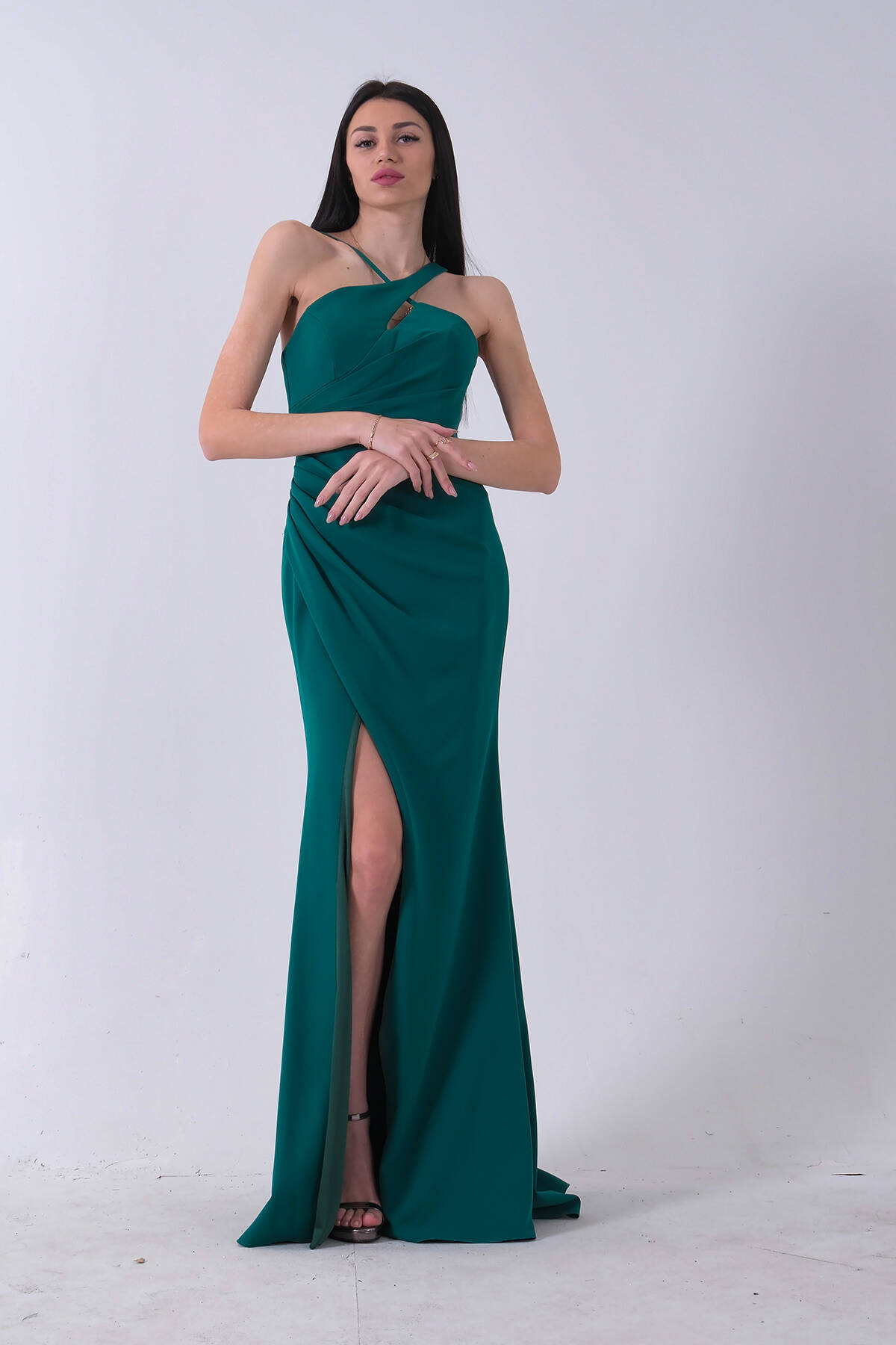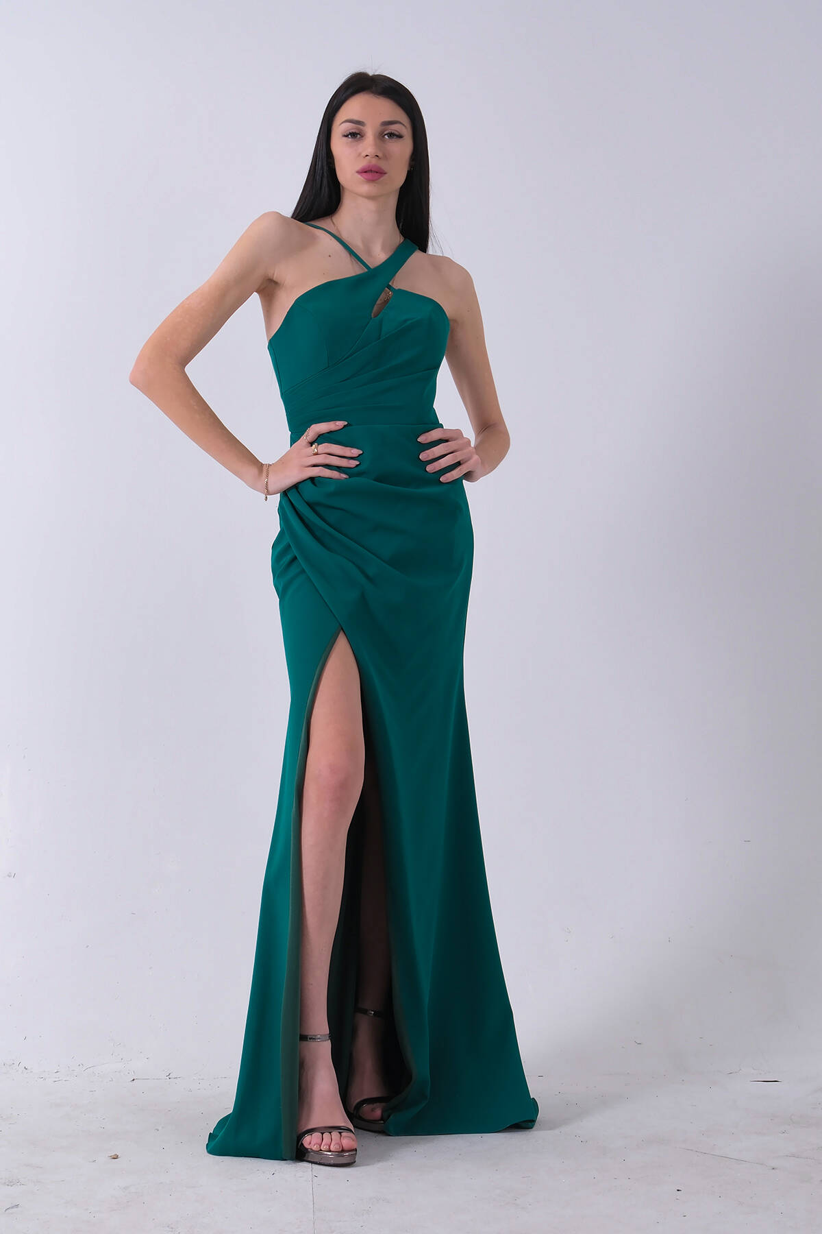 Modern zarafet, etkileyici duruşla buluşuyor! Tüm renkleriyle göz alıcı bir stile sahip bu uzun abiye elbise, özel davetlerde şıklığınızla fark yaratmanızı sağlıyor. Önden çapraz gelen kruvaze yaka tasarımı ve bacak yırtmacı ile cesur ama asil bir görünüm sunar. Minimal detaylarla zenginleştirilmiş bu tasarım; düğün, mezuniyet, nişan ve gece davetleri için ideal bir tercihtir.