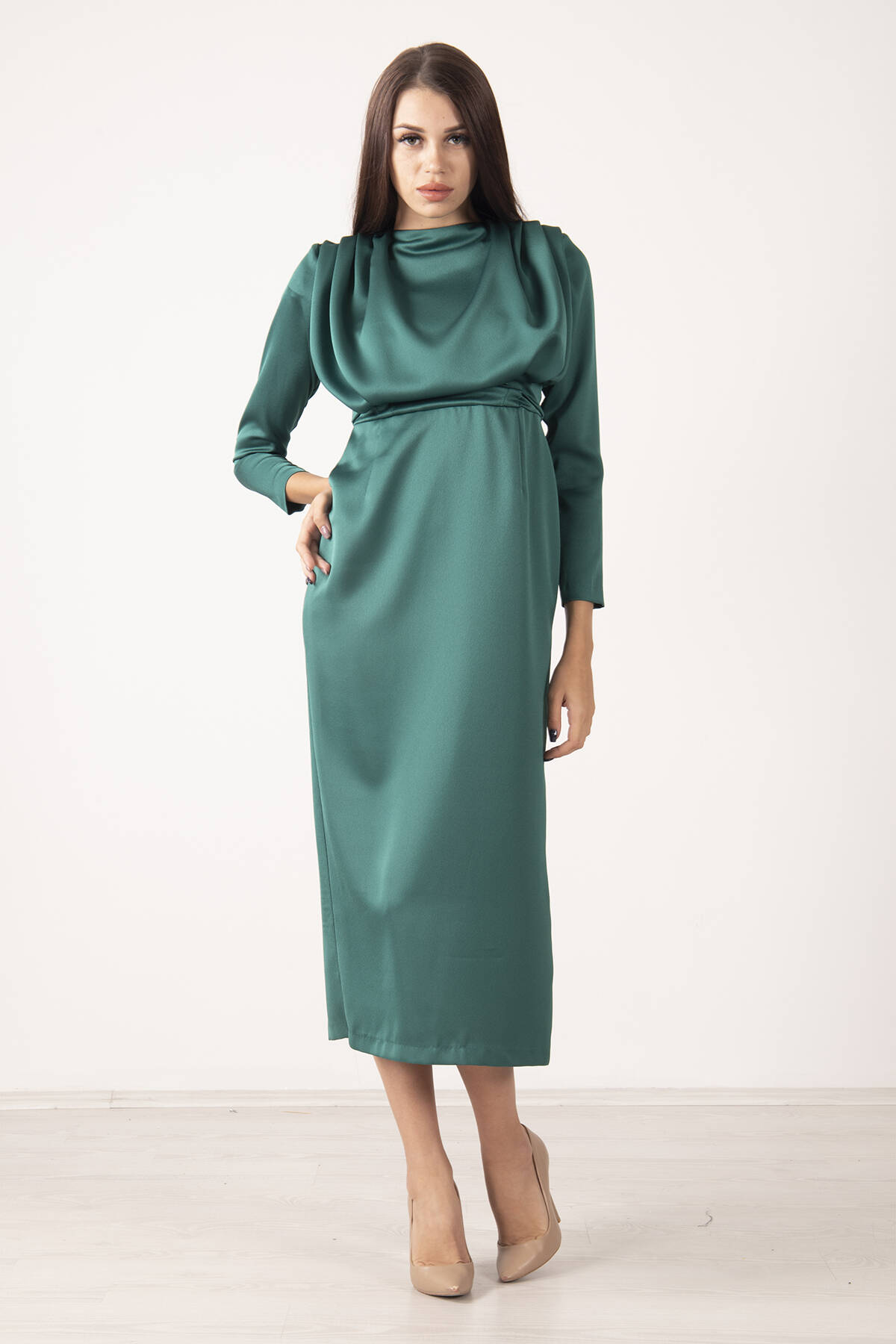 Modelin Ölçüleri : Boy: 1.75 cm / Göğüs: 87 cm / Bel: 66 cm /Basen : 94 cm Mankenin Üzerindeki Ürün 36/S Bedendir %100 Polyester Uzun Kol Omuzu Vatkalı Bisiklet Yaka Üzeri Plise Detaylı Astarlı Saten Abiye Elbise Ürün Boyu: 131 cm Stüdyo Çekimlerinde Renkler Işık Farklılıgından Dolayı Değişiklik Gösterebilir. (Dikkat! Ürünlerimiz güvenlik bandı ile gönderilmektedir . Güvenlik bandı olmayan ürünlerin iadesi kabul edilmeyecektir)